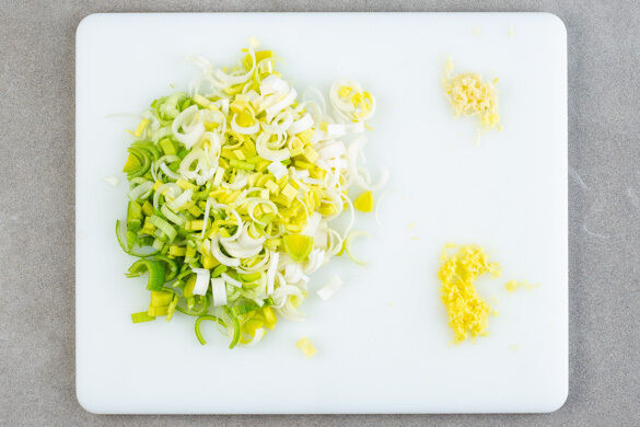 In einem kleinen Topf 400ml leicht gesalzenes Wasser zum Kochen bringen. Den Lauch längs halbieren und in dünne Streifen schneiden. Den Knoblauch und den Ingwer schälen und fein reiben oder sehr fein würfeln.
