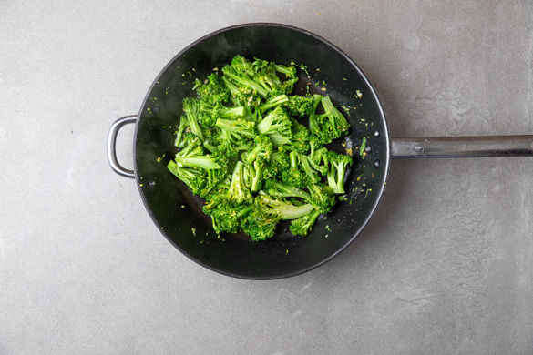 Den Brokkoli in 2–3cm große Röschen schneiden. Den restlichen Ingwer in derselben Pfanne mit 1EL Pflanzenöl erhitzen, dann den Brokkoli und 2–3EL Wasser dazugeben und abgedeckt bei mittlerer Hitze 3–4Min. dämpfen. Anschließend ohne Deckel köcheln lassen, bis das Wasser verdampft ist.