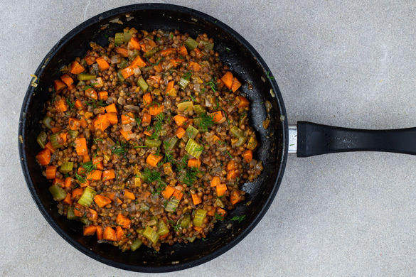 Die Zwiebeln, die Karotten und den Sellerie in derselben Pfanne mit 2EL Olivenöl bei mittlerer Hitze 2–3Min. farblos anschwitzen. Den Knoblauch und die Aprikosen untermischen. Mit den Linsen samt Flüssigkeit ablöschen, alles kurz aufkochen lassen und 2–3Min. sanft köcheln. Nach Geschmack mit der Gewürzmischung, Salz, Pfeffer und Essig würzen.