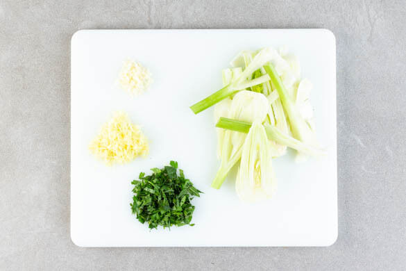 In einem mittelgroßen Topf 600ml leicht gesalzenes Wasser für den Reis zum Kochen bringen. Den Fenchel halbieren und in ca. 0,5cm dünne Scheiben schneiden. Den Knoblauch schälen und fein würfeln. Die Minze- und Basilikumblätter von den Stängeln zupfen und fein schneiden. Die Petersilie samt Stängeln ebenfalls fein schneiden. Die Zitronenschale abreiben.