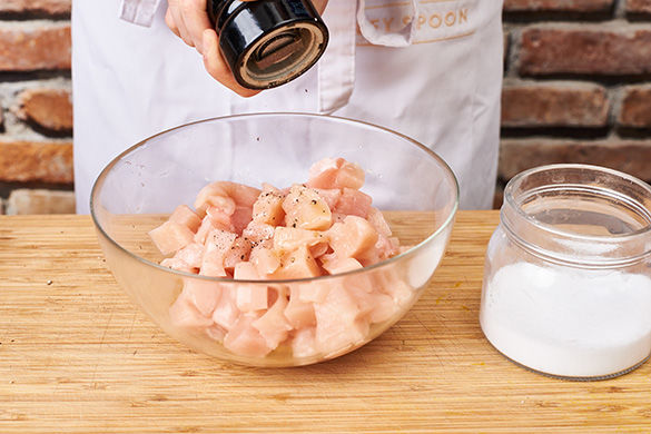 Die Hähnchenbrust in 1-2cm große Würfel schneiden und mit 2EL Olivenöl, Salz und Pfeffer würzen. Einen großen Topf mit ausreichend gesalzenem Wasser für die Pasta zum Kochen bringen.