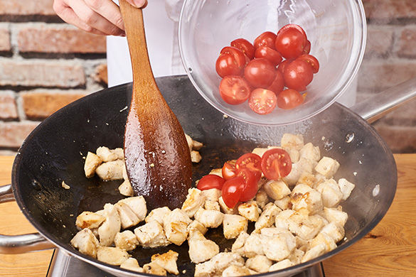 Inzwischen in der Pfanne das Hähnchen ca. 2-3Min. scharf anbraten und mit Salz und Pfeffer würzen. Die Tomaten hinzugeben und weitere ca. 1-2Min. bei mittlerer Hitze mit braten.