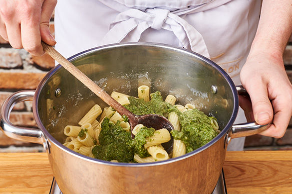 Heute in der Box: saftige Hähnchenwürfel werden gemeinsam mit Tomaten saftig gebraten. Dazu gibt es Rigatoni-Pasta mit einem selbstgemachten Pesto aus Walnüssen und Basilikum und ganz viel geriebenen Käse. Auf die Löffel, fertig, los!