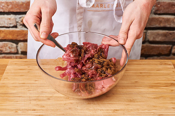 Das Fleisch mit dem Sesamöl und nach Geschmack dem Gewürz in einer Schüssel marinieren. Zur Seite stellen.