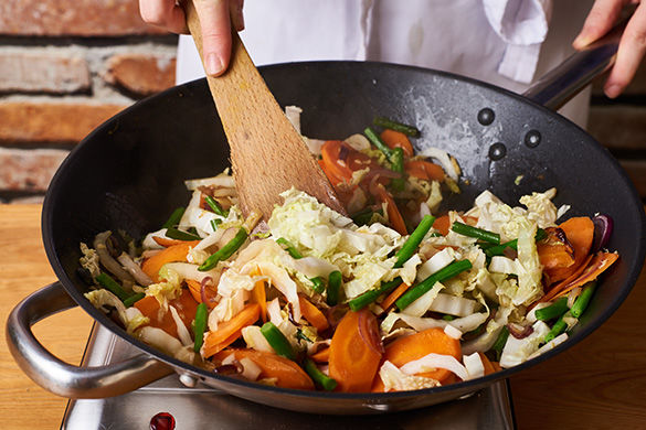Die Zwiebeln und die Karotten schälen, halbieren und schräg in feine Streifen/Scheiben schneiden, den Chinakohl ebenso fein schneiden. Die Bohnen vom Strunk befreien und dritteln. Einen Topf mit leicht gesalzenem Wasser zum Kochen bringen.