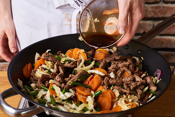 Eine große Pfanne hoch erhitzen und das Fleisch darin ca. 2-3Min. scharf anbraten. Aus der Pfanne nehmen und beiseite stellen. Nun in der gleichen Pfanne das Gemüse mit 1-2EL Öl ca. 4-5Min. knackig braten.