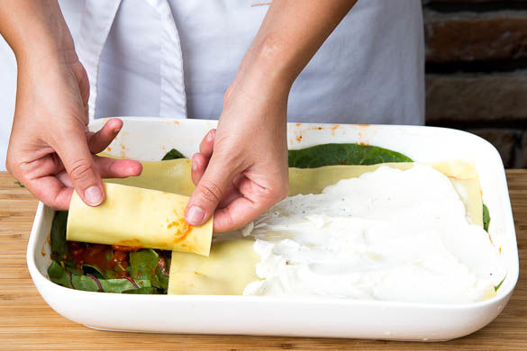 In einer Auflaufform etwas Tomatensauce verteilen, 2 Lasagneblätter darauflegen, mit Tomatensauce und Mangoldblättern sowie 2 Lasagneblätter bedecken. Mit der Hälfte des Ricotta bestreichen, Tomatensauce und Mangoldblätter darauf verteilen, mit 2 Lasagneblättern abschließen. Das Ganze nochmals wiederholen, bis Blätter und Sauce aufgebraucht ist.