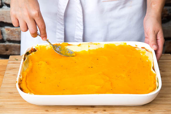 Die Lasagne nun mit dem Butternusskürbis-Püree bestreichen. Den Käse darüber verteilen und mit Salz und Pfeffer würzen. Im Ofen ca. 18-20Min. goldbraun backen.