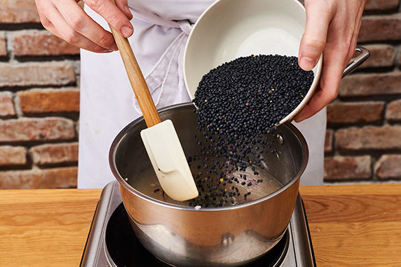 Die Linsen in die kochende Brühe geben und bei geringer Hitze ca. 15–20Min. kochen, bis das Wasser verdampft ist und die Linsen weich sind. Den Topf vom Herd nehmen.