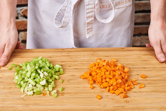 Inzwischen die Karotten schälen und in feine Würfel schneiden. Den Sellerie ebenfalls in feine Würfel schneiden.