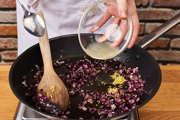 Die Zwiebeln und die Cranberrys in einer mittelgroßen Pfanne mit 1–2EL Olivenöl bei mittlerer Hitze ca. 2–3Min. goldbraun anschwitzen. Mit 1–2EL Essig ablöschen und auf niedrigster Stufe ca. 1–2Min. weiterbraten, bis die Flüssigkeit verdampft ist und die Zwiebeln weich sind. Aus der Pfanne nehmen.