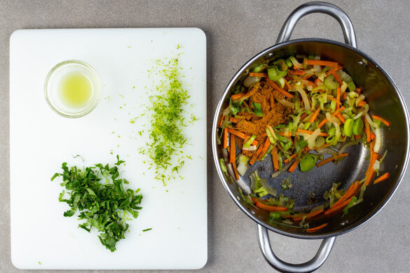 Den Koriander samt Stängeln grob schneiden. Die Limettenschale abreiben, dann die Limette halbieren und auspressen. Den Knoblauch, den Ingwer und die 1/2 der Currypaste zu dem Gemüse in den Topf geben und ca. 1Min. mitbraten.