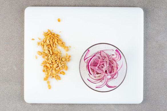 Die Zwiebel schälen und halbieren, eine Hälfte in feine Streifen schneiden, die übrige Hälfte für ein anderes Rezept aufbewahren. Die Zwiebelstreifen mit dem restlichen Limettensaft und 1 Prise Salz vermengen. Die Erdnüsse grob hacken.