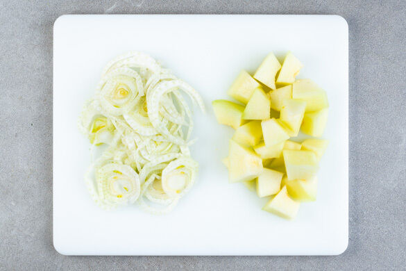 Die Melone halbieren. Von einer Hälfte die Schale und die Kerne entfernen und das Fruchtfleisch in ca. 2cm große Würfel schneiden. Tipp: Die übrige Melone z. B. für einen Obstsalat verwenden. Den Fenchel längs halbieren und in feine Streifen schneiden.
