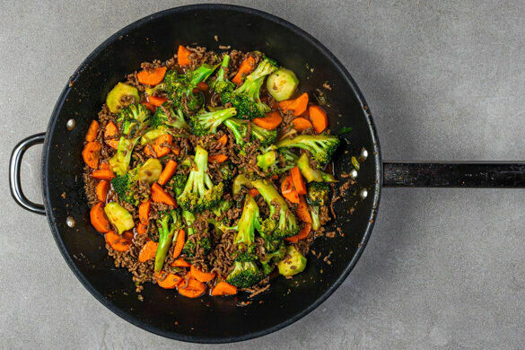 Die Karotten und den Brokkoli in die Pfanne geben und 1–2Min. mitbraten. Die Würzsauce unterrühren und bei starker Hitze 5–6Min. abgedeckt köcheln lassen, bis der Brokkoli gar ist. Anschließend ohne Deckel 2–3Min. einköcheln lassen, bis die Sauce eingedickt ist und Brokkoli und Hackfleisch gleichmäßig bedeckt sind. Regelmäßig umrühren.