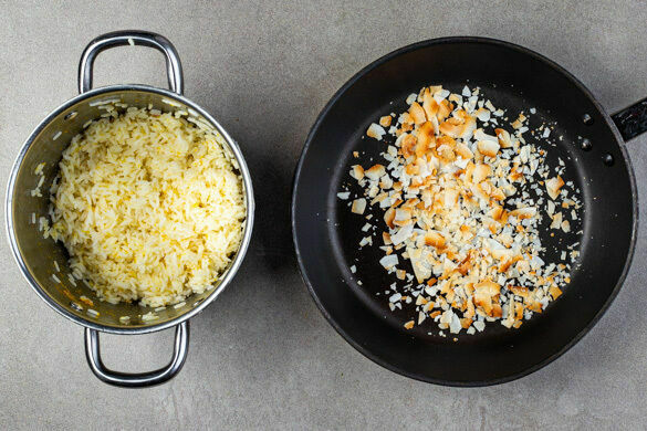 In einem mittelgroßen Topf 600ml leicht gesalzenes Wasser zum Kochen bringen. Den Reis in einem Sieb kalt abspülen, bis das Wasser klar bleibt. Sobald das Wasser kocht, den Reis hineingeben und abgedeckt bei niedrigster Hitze 10–12Min. kochen, bis das Wasser aufgesogen und der Reis gar ist. Noch ca. 5Min. ohne Hitzezufuhr ziehen lassen.