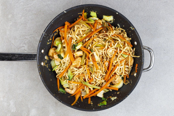 Mit unserem schnell gezauberten Bami Goreng mit saftigen Garnelen, crunchy Karotten und Pak Choi sowie sojawürzigen Mie-Nudeln hast du ganz fix dein Abendessen auf dem Tisch. Frischer Ingwer und Koriander sorgen für extra viel Aroma. Wer jetzt noch zum Asia-Imbiss geht, hat selber Schuld.
