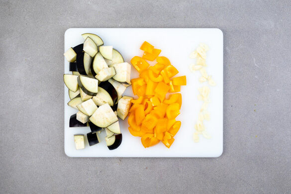 Den Backofen auf 220°C (200°C Umluft) vorheizen. Die Auberginen längs vierteln und in ca. 1cm breite Stücke schneiden. Die Paprika vierteln, entkernen und in ca. 2cm große Würfel schneiden. Den Knoblauch schälen, eine Knoblauchzehe in feine Scheibchen schneiden, die andere Knoblauchzehe für später beiseitelegen.