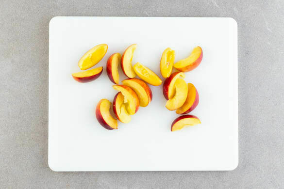 Die Nektarinen rundherum einschneiden und die Hälften auseinanderdrehen. Das Fruchtfleisch in dünne Spalten schneiden, den Stein entfernen.