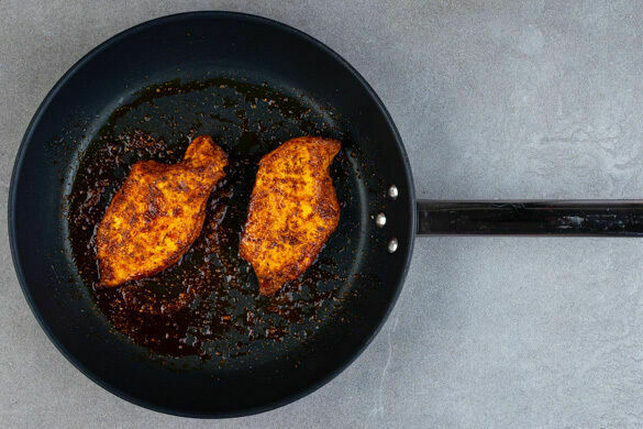 Das Fleisch trocken tupfen, jeweils horizontal halbieren und zwischen Frischhaltefolie ca. 1cm dünn plattieren. 2EL Olivenöl mit der Gewürzmischung, 1/2TL Salz und 1 kräftigen Prise Pfeffer verrühren. Das Fleisch rundum mit dem Würzöl einreiben und in einer großen Pfanne bei mittlerer Hitze auf jeder Seite 4–5Min. goldbraun anbraten.