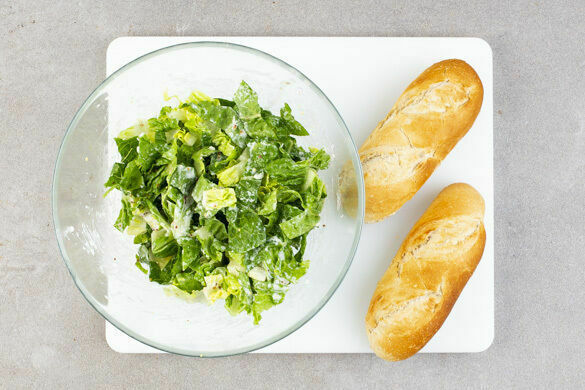 Den Salat mit ca. 2/3 des Dressings vermengen. Das Fleisch in Tranchen schneiden. Die Brötchen aufschneiden und die Schnittflächen mit der übrigen Knoblauchhälfte einreiben, dann mit dem restlichen Dressing bestreichen und mit etwas Salat, dem Fleisch und den Käsescheiben belegen. Mit den Karottenpommes und dem restlichen Salat servieren.