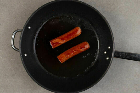 Die Rauchwürste jeweils quer halbieren und in einer großen Pfanne mit 1EL Olivenöl bei mittlerer Hitze ca. 3Min. auf jeder Seite braten.