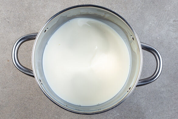 500ml Milch mit 300ml Wasser in einem mittelgroßen Topf zum Kochen bringen. Vorsicht, die Milch darf nicht überkochen oder anbrennen. Sobald sich kleine Bläschen bilden, die Milch nicht aus den Augen lassen. Die restliche Milch wird nicht benötigt.