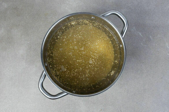 In einem mittelgroßen Topf 650ml leicht gesalzenes Wasser zum Kochen bringen. Die Quinoa in einem feinmaschigen Sieb mit warmem Wasser abspülen, in das kochende Wasser geben und 10–12Min. abgedeckt bei niedriger bis mittlerer Hitze sanft köcheln lassen. Vom Herd nehmen und bis zum Servieren warm halten.