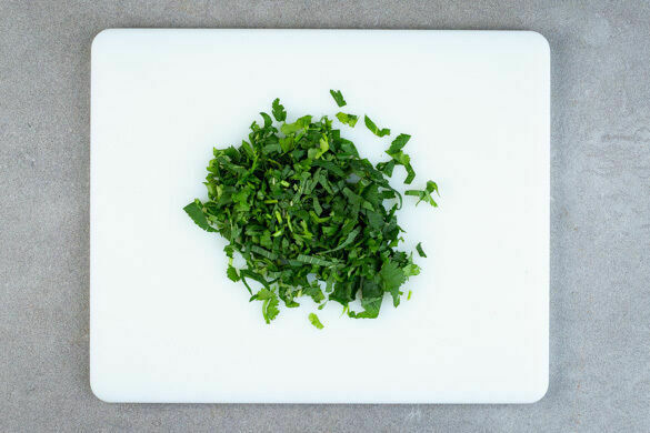 Die Minzeblätter abzupfen. Die Minzeblätter und den Koriander samt Stängeln fein schneiden.