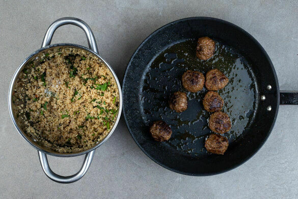Die Fleischbällchen in einer großen Pfanne mit 1EL Olivenöl bei mittlerer Hitze 4–6Min. rundum appetitlich braun braten. Die Quinoa mit der 1/2 der Kräuter vermengen und mit Salz und Pfeffer abschmecken. Die Fleischbällchen mit der Quinoa, dem Salat und dem Gurkenjoghurt anrichten und mit den restlichen Kräutern garniert servieren.