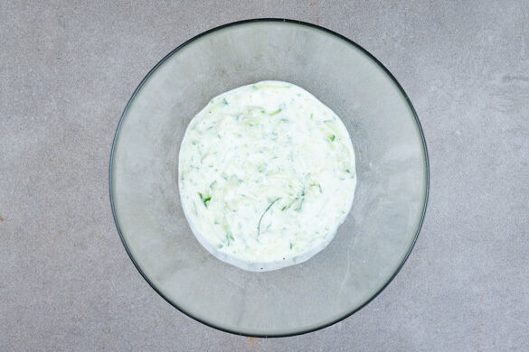 Den Knoblauch schälen und sehr fein würfeln oder durch eine Knoblauchpresse drücken. Die Gurke grob reiben und mit dem Joghurt und dem Knoblauch vermengen. Den Gurkenjoghurt mit Salz und Pfeffer abschmecken.