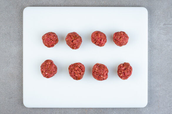 Das Hackfleisch gründlich mit 2TL Gewürzmischung sowie je 1 Prise Salz und Pfeffer verkneten und zu 8 Bällchen formen. Tipp: Für extra saftige Fleischbällchen das Hackfleisch mit 1–2TL Wasser oder Sahne vermengen.