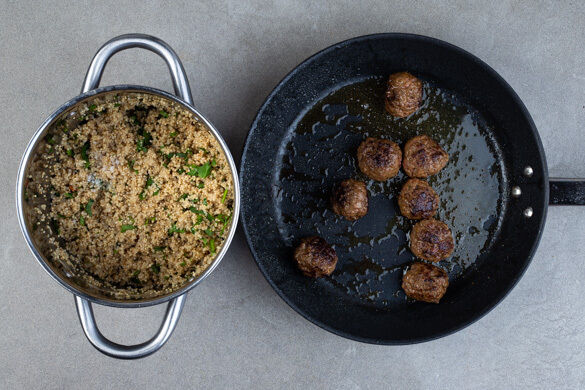 Die Fleischbällchen in einer mittelgroßen Pfanne mit 1EL Olivenöl bei mittlerer Hitze 4–6Min. rundum appetitlich braun braten. Die Quinoa mit der 1/2 der Kräuter vermengen und mit Salz und Pfeffer abschmecken. Die Fleischbällchen mit der Quinoa, dem Salat und dem Gurkenjoghurt anrichten und mit den restlichen Kräutern garniert servieren.