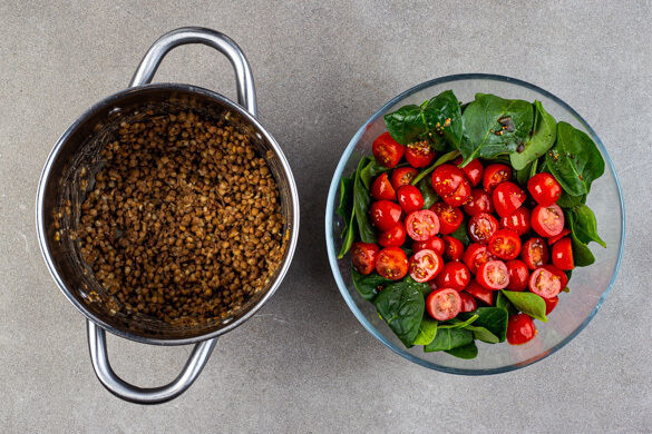 Währenddessen die Linsen bei mittlerer Hitze erwärmen, dabei ab und an umrühren und aufpassen, dass die Linsen nicht anbrennen. Die Kirschtomaten halbieren und mit 2EL Olivenöl sowie je 1 kräftigen Prise Salz und Pfeffer vermengen. Den Spinat nach Wunsch grob schneiden und mit dem Dressing unter die Tomaten mischen.