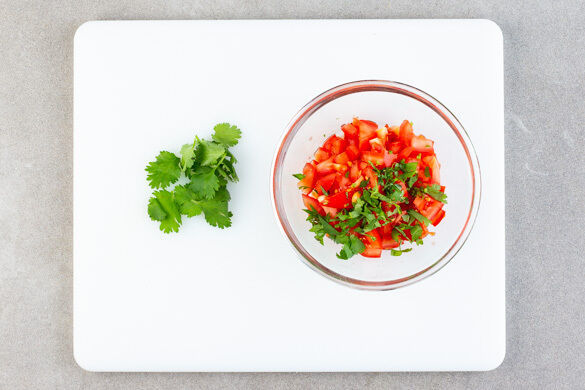 Die Tomaten in kleine Würfel schneiden. 1EL Korianderblätter für die Garnitur aufbewahren, den restlichen Koriander samt Stängeln fein schneiden und mit den Tomaten vermengen. Aus 1–2EL Olivenöl, 1–2EL Limettensaft sowie je 1 Prise Zucker, Salz und Pfeffer ein Dressing anrühren und kurz vor dem Servieren mit den Tomaten mischen.