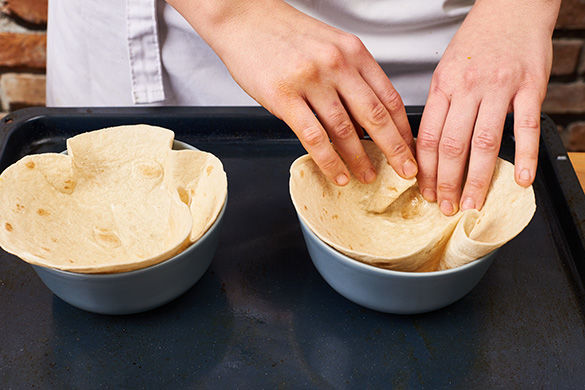Inzwischen eine Seite der Tortillas mit 1TL Olivenöl bestreichen, und mit der Öl-Seite nach oben in 2 ofenfeste Schalen legen. Im Ofen ca. 8-10Min. goldbraun und knusprig backen.