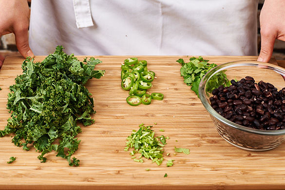 Grünkohl ggf. vom Strunk befreien und in feine Streifen schneiden. Chili fein hacken, wer es weniger scharf mag, verwendet weniger und entfernt die Kerne. Korianderblätter abzupfen, Stiele fein hacken, Blätter in feine Streifen schneiden. Bohnen in einem Sieb abspülen und abtropfen. Ofen auf 180°C Umluft vorheizen.
