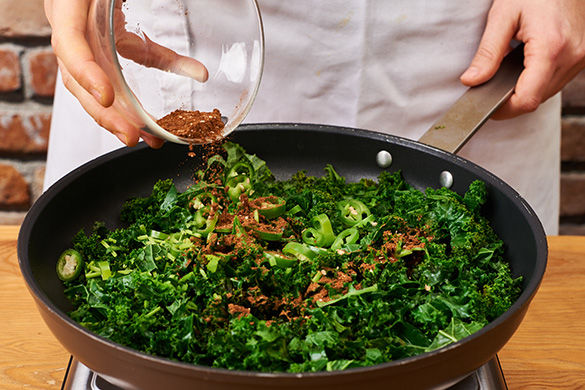 In einer großen Pfanne 1-2EL Olivenöl mittelhoch erhitzen, den Grünkohl darin mit 3-4EL Wasser, den Korianderstielen,gehackten Chili und Molegewürz ca. 2Min. braten, dann nochmals mit etwas Wasser besprenkeln und zugedeckt ca. 5-6Min. dünsten, bis der Grünkohl leicht eingefallen ist.