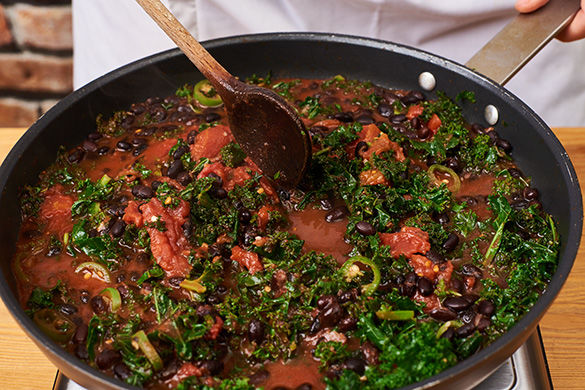 Nun die passierten Tomaten, 100ml Wasser, den Limettenabrieb sowie die Bohnen zu dem Grünkohl geben und ca. 3-5Min. einköcheln lassen. Mit Salz und Pfeffer abschmecken.
