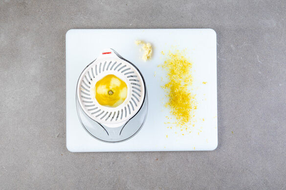 Die Zitronenschale abreiben, dann die Zitrone halbieren und auspressen. Den Knoblauch fein reiben oder sehr fein würfeln.