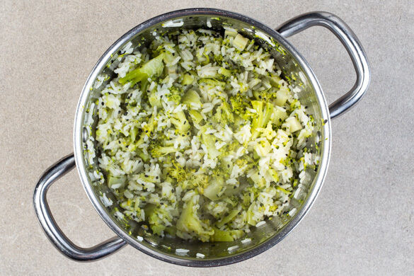 Den Reis in einem Sieb kalt abspülen, bis das Wasser klar bleibt. Sobald das Wasser kocht, den Reis, den Brokkolistrunk und die Brokkoliröschen hineingeben und abgedeckt bei niedrigster Hitze 10–12Min. kochen, bis das Wasser aufgesogen ist und der Reis und der Brokkoli gar sind. Noch ca. 5Min. ohne Hitzezufuhr ziehen lassen.