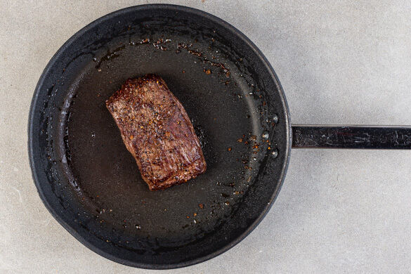 Das Fleisch trocken tupfen, mit Salz und Pfeffer würzen und in einer großen Pfanne mit 2EL Olivenöl bei starker Hitze auf der Fettseite 2–4Min. scharf anbraten. Wenden und weitere 2–4Min. braten, je nach Dicke des Fleisches. Die Hitze reduzieren und das Fleisch 1–3Min. abgedeckt garen, je nachdem, ob es medium oder durch sein soll. Abgedeckt auf einem Teller ruhen lassen.