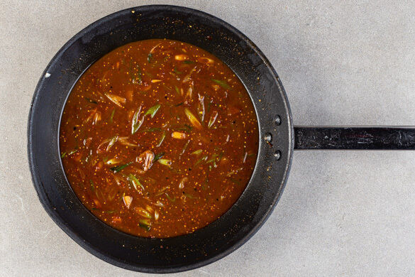 Den Knoblauch schälen und grob würfeln. Die Lauchzwiebeln schräg in dünne Ringe schneiden, das Lauchzwiebelgrün für die Garnitur beiseitelegen. Den Knoblauch und die weißen Lauchzwiebeln in derselben Pfanne mit 3EL Butter bei mittlerer bis niedriger Hitze 1–2Min. anschwitzen. Die 1/2 des Brühgewürzes, die Misopaste, 1EL Senf und 200ml Wasser einrühren.