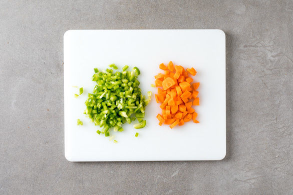 Die Paprika vierteln, entkernen und in kleine Würfel schneiden. Die Karotten ggf. schälen, längs vierteln und in ca. 0,5cm kleine Würfel schneiden.