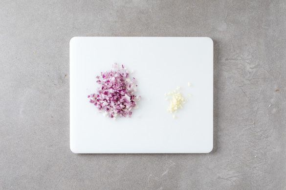 In einem mittelgroßen Topf 600ml leicht gesalzenes Wasser für den Reis zum Kochen bringen. Die Zwiebel schälen, halbieren und in feine Würfel schneiden. Den Knoblauch schälen und ebenfalls fein würfeln.