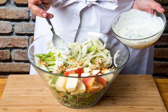 Die Apfelstücke, den Sellerie und den Fenchel mit dem gemischten Salat vermengen. Die 1/2 der Walnüsse und ca. 2/3 des Dressings untermischen.