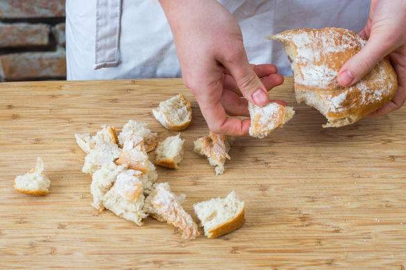 Währenddessen die Walnüsse in einer kleinen Pfanne auf mittlerer Hitze ca. 3–4Min. ohne Fett anrösten. Vom Herd nehmen und beiseitestellen. Das Brötchen in ca. 1–2cm große Stücke schneiden oder reißen und mit 1–2TL ÖL, Salz und Pfeffer würzen. Die Brötchenstücke auf einem Backblech verteilen und im Ofen ca. 8–10Min. rösten, bis sie knusprig sind.