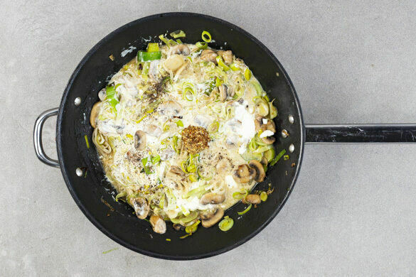 Die Pilze in derselben Pfanne mit 1EL Olivenöl bei mittlerer Hitze 3–5Min. anbraten. Den Lauch hinzufügen und 1–2Min. mitbraten. 1EL Mehl, dann die Crème fraîche und 250ml Pastawasser unterrühren und das Brühgewürz in der Sauce auflösen. Das Fleisch hinzugeben und 1–2Min. in der Sauce köcheln lassen. Nach Belieben das übrige Pastawasser unterrühren.