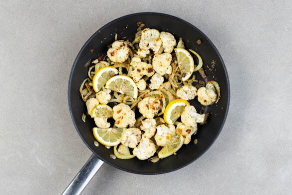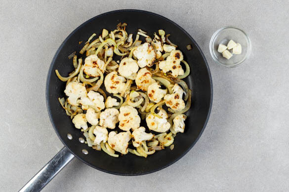 Den Blumenkohl, den Fenchel und die 1/2 der Zwiebeln in einer großen Pfanne mit 1EL Olivenöl und je 1 kräftigen Prise Salz und Pfeffer bei mittlerer bis starker Hitze in 7–9Min. goldbraun anbraten, dabei gelegentlich umrühren. Inzwischen den Knoblauch schälen und vierteln.