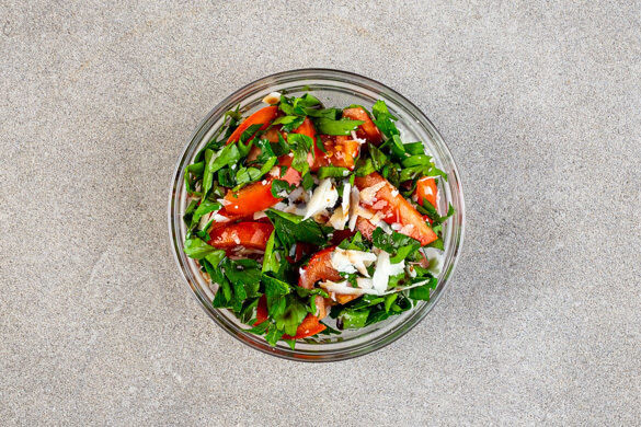 Die Tomaten halbieren und in dünne Scheiben schneiden. Die Petersilie samt Stängeln fein schneiden. Den Käse mit einem Sparschäler in feine Scheiben hobeln.